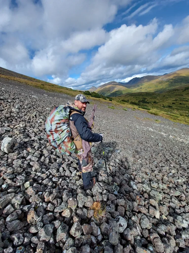 We awoke to bright blue skies. The storm had moved out, and all that remained was the white blanket over the mountain peaks. We headed up to Gump Mountain. As we were almost at the top of the ridge , we stopped for a water break. We glassed the adjacent mountain. Then it happened . “Cap.” The one word from my partner that unleashed a lifelong dream. He spotted a good bull and herd of Caribou . I finally got a glimpse and could see multiple racks of bulls making their way up a creek bed to the top of the mountain . We knew we were in for an adventure as it was good descent down from where we were and a good climb back up to the caribou. We hit the big meadow at the bottom of the valley. Willows ,intertwined, made for quite the trek through the bottom. One slow-moving creek about 3 feet deep made for a quick dip across the meadow. As we beat willows and scrub, we started our ascent through jackpine trees. Lots of moose and caribou sign. They definitely hide well in the timbers. We broke out into the open and hiked hill after hill, trying to get closer to the herd. We finally crested and got a glimpse. We had to be about 800 yds away at first look. Our range finders couldn’t pick up distance as a light haze in the air prevented a clear reading. The herd was bedded in the rocks and had a clear 360-degree view from their roost. We were definitely exposed. We decided to slowly crawl, crouch, shimmy , from shrub to shrub. Making our way closer and closer , the minutes turned to hours as we carefully planned our path to the bou. We finally hit the 500 yd mark . Six hours from descending down from our original spot. I had spent lots of time on my rifle, so I was very comfortable at the distance. I just had to wait for my opportunity to present itself. One cow was very tentative and was definitely aware of our presence . We tried moving a few yards closer for a better rest, and the herd spooked. They busted out in full gallop, and I thought my chance was gone. The bigger bull trailed the herd and stopped for one last look. I held steady at 490 yds, slowly squeezed the trigger, and the shot rang out across the mountain. The caribou disappeared over the mountain, except for one. I collected myself. Excitement overtaking me, I shed some tears. My hunting partner grabbed my hand in excitement and congratulated me on our day long stalk. It was still a hike up the last steep 500 yds. Through snow and rocks, we made it my bull. Words can’t express what I felt that day. The views. The smells. The magnificent animal whose life I had taken. He was unlike any animal I had ever seen. His velvet antlers had swirls of color. His dark summer coat shined against the snow-covered flora. I couldn’t stop admiring this beautiful animal that lie before me. We made some mountain meals and spent some time with my animal. Distant storms lit up the skies as we rested for the work still before us.
