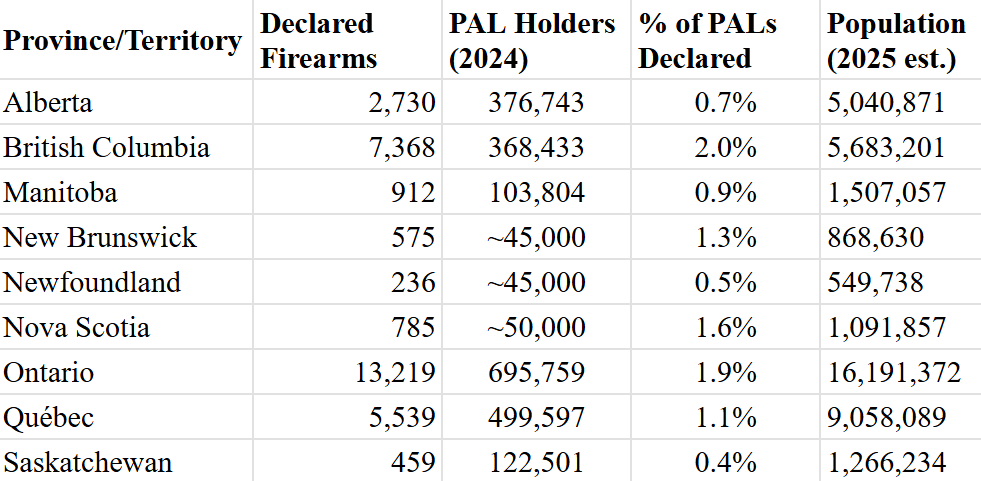 Graph showing declared firearms, number of PAL holders, the percentage of declared to PAL holders, and total provincial populations. Information from: https://www.canada.ca/en/public-safety-canada/campaigns/firearms-buyback/number-firearms-declared-province-territory.html?fbclid=IwdGRjcAQIs6djbGNrBAiyfWV4dG4DYWVtAjExAHNydGMGYXBwX2lkDDM1MDY4NTUzMTcyOAABHq0nffY2nWjZyJzFPbuk5G82cLlBCJVs3WqOC8PUv1DLCdSdTsPTBMq6-yTl_aem_85Q09qXtrgBN8eDs7lAw_A